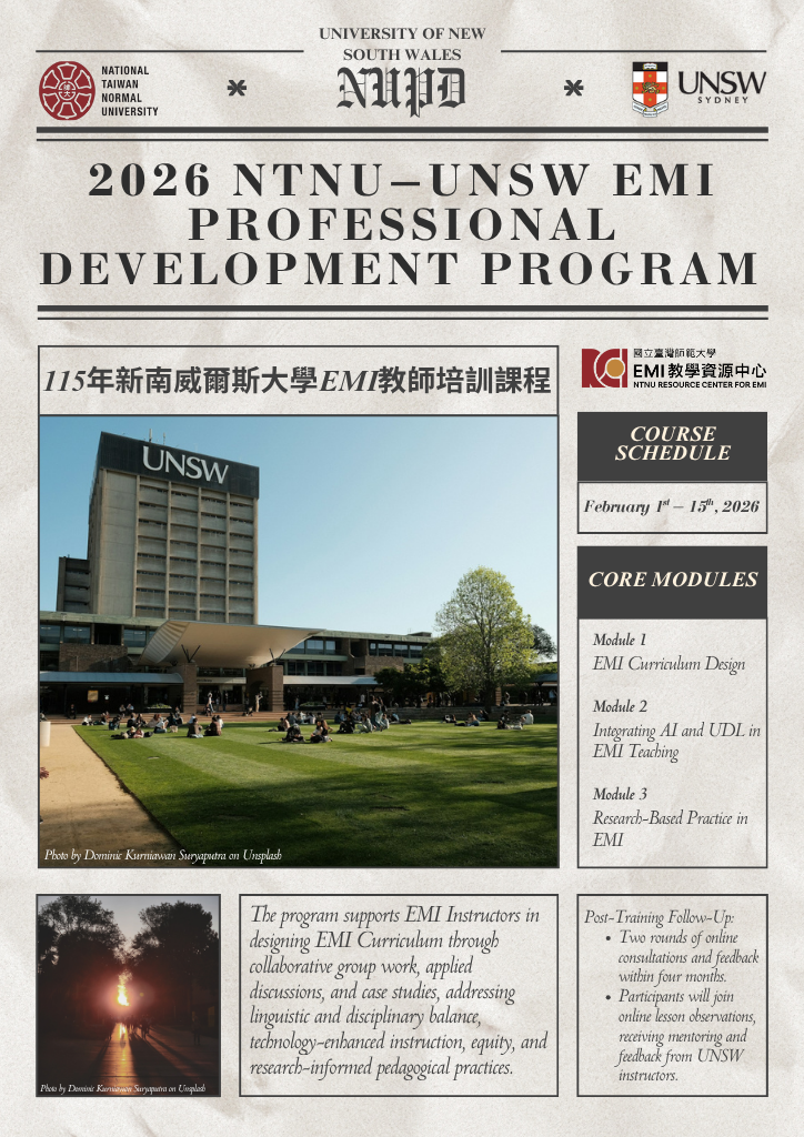 國立臺灣師範大學 EMI 教學資源中心「2026年新南威爾斯大學 EMI 教師培訓課程」現已正式開放報名,誠摯邀請貴校推薦各領域之 EMI 教師申請參與。 此課程為由本中心與澳洲雪梨新南威爾斯大學(University of New South Wales, UNSW)共同規劃,為期兩週(2026 年 2 月 1 日至 2 月 15 日)之海外移地培訓課程。課程聚焦於EMI 課程設計、AI 與全方位學習設計(UDL)應用,以及教學研究實踐(SoTL),旨在協助教師強化 EMI 教與學的實務能力,並推動教學創新與研究融合。 中心將於 11月24日(星期一)12:15–12:45 舉行線上說明會,並現場解答相關問題。 誠摯邀請有興趣的師長與單位於 11月20日(星期四)前 填寫報名表單(https://forms.gle/xyJrLCHdMyWLe9Kg7) ,以便我們妥善安排。 歡迎踴躍報名!期待與您線上交流,謝謝! 請點擊連結了解更多課程資訊