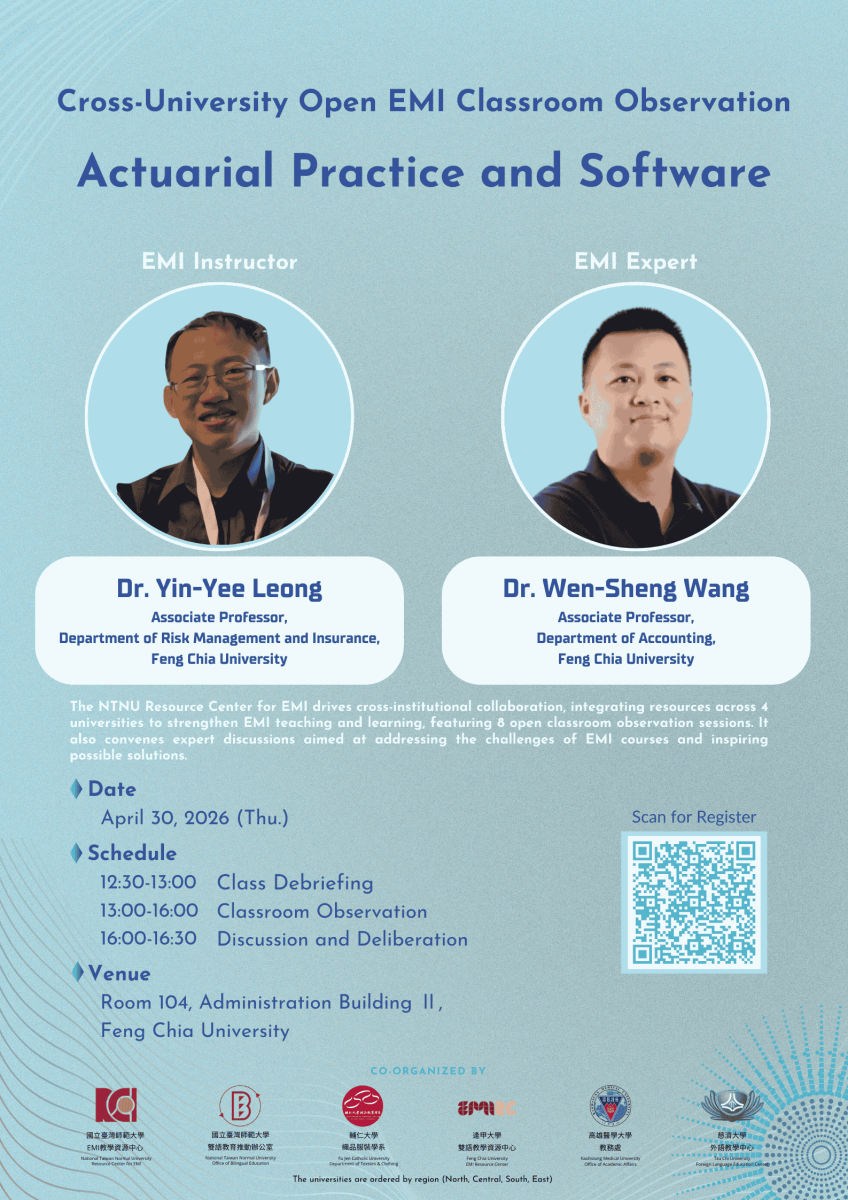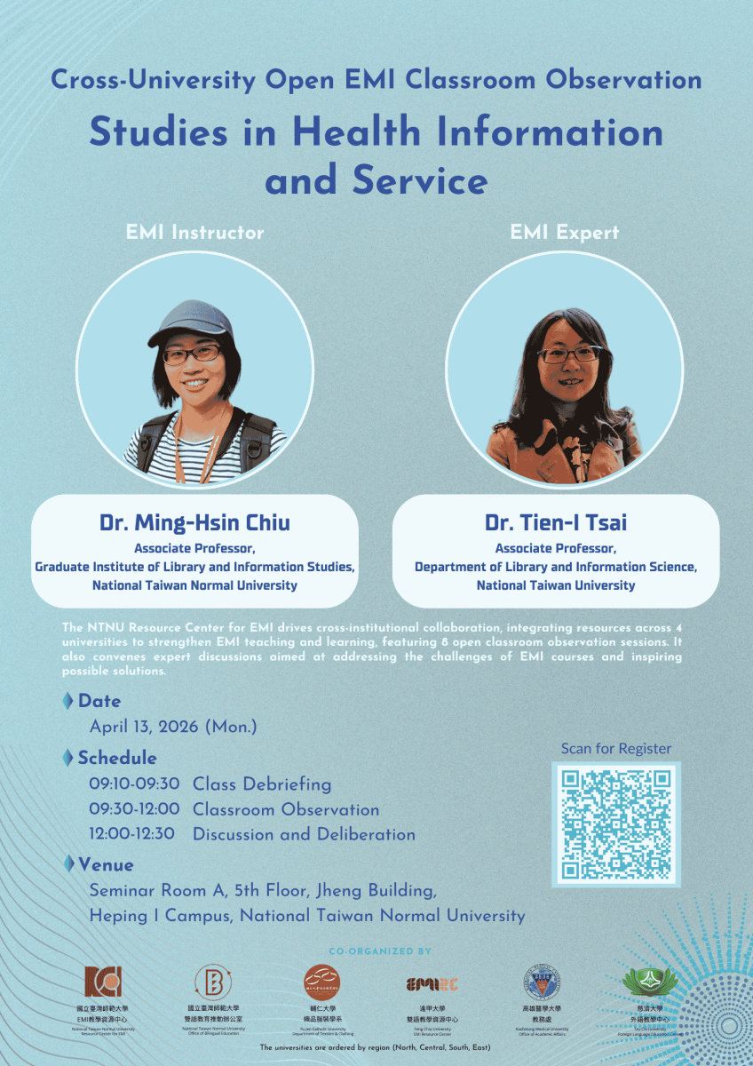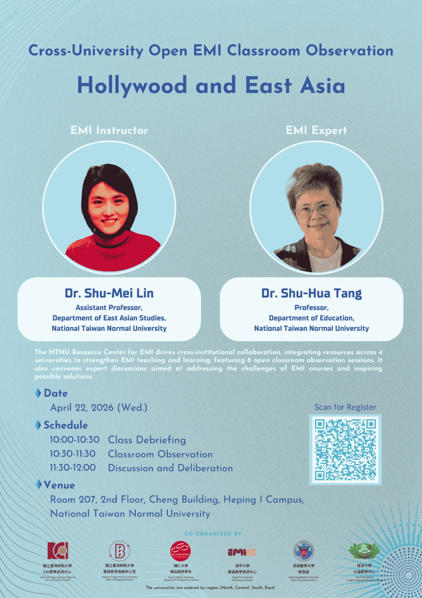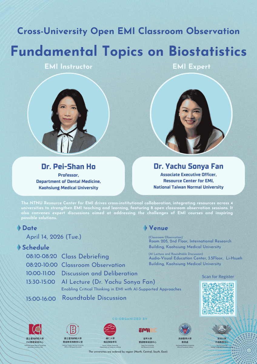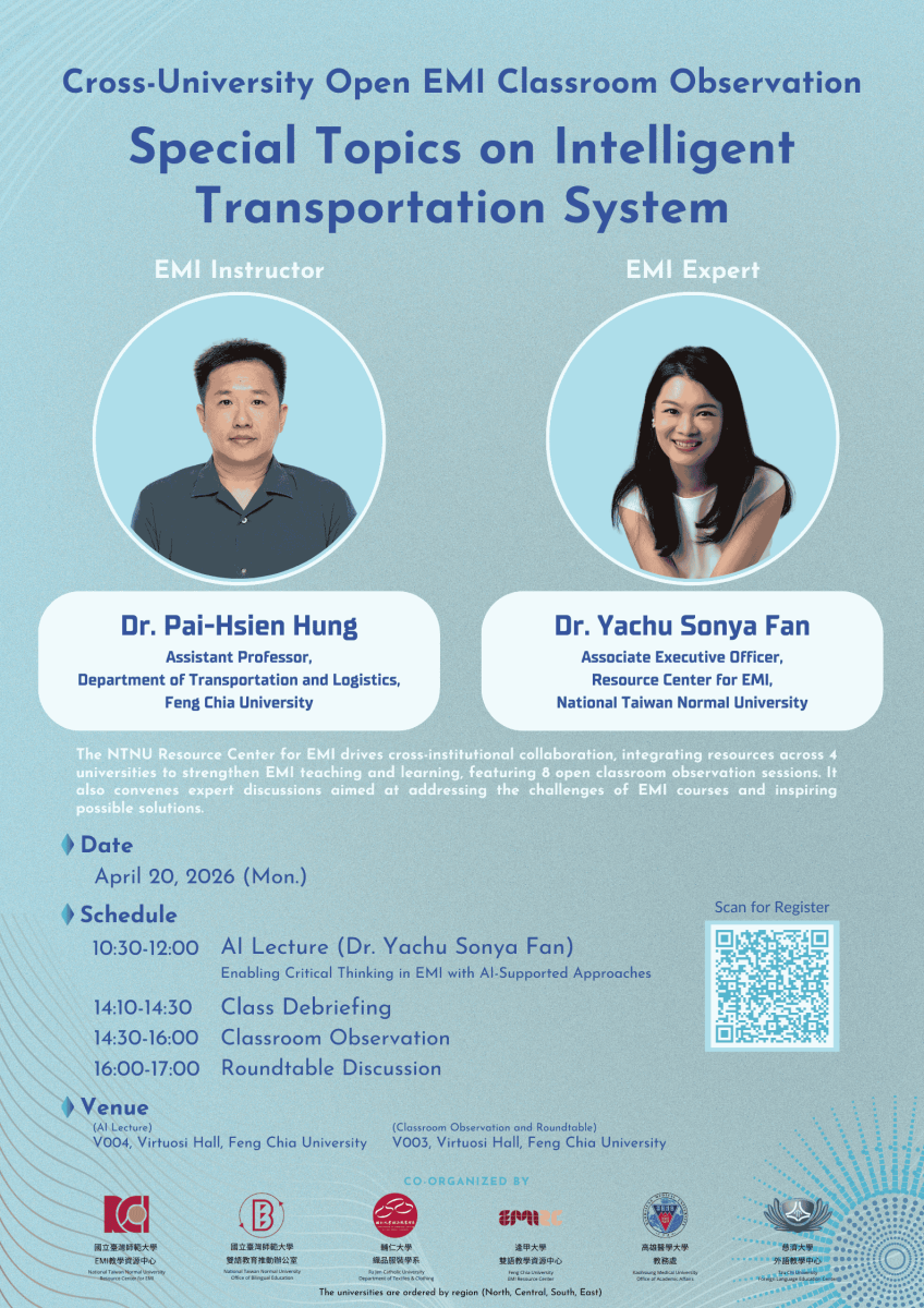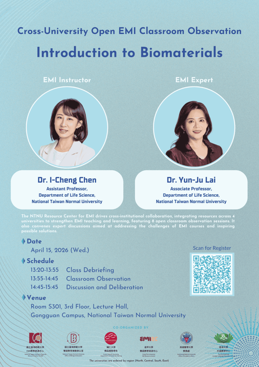國立臺灣師範大學EMI教學資源中心於114學年度第2學期,與輔仁大學、逢甲大學、高雄醫學大學、慈濟大學合作舉辦八場《跨校公開觀議課》、兩場《雙語聯盟圓桌會議》及兩場《AI 工作坊》。