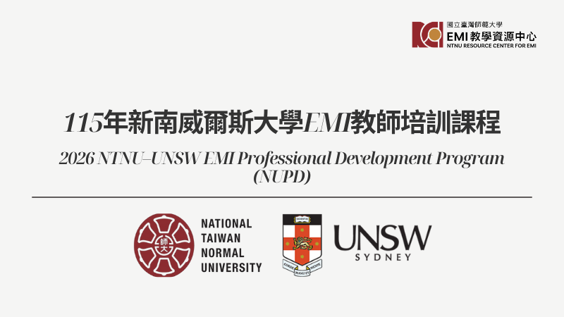 115年新南威爾斯大學EMI教師培訓課程 (移地訓練) NTNU-UNSW EMI Professional Development Program (NUPD) 國立臺灣師範大學 EMI 教學資源中心(Resource Center for EMI, RCEMI)長期致力於推動 EMI 教師專業發展,為回應國內教師對進階培訓的需求,本中心與澳洲雪梨新南威爾斯大學(University of New South Wales, UNSW)合作,獨家設計客製化寒假移地培訓課程,聚焦 EMI 課程設計、AI 與全方位學習設計(UDL)應用、以及教學研究實踐。課程除著重於 EMI 教學與評量的實務策略外,亦鼓勵教師開展與 EMI 相關的教學研究計畫(SoTL),以理論與實踐並進的方式,推動教學革新與學術成長。課程學費由本計畫支應。